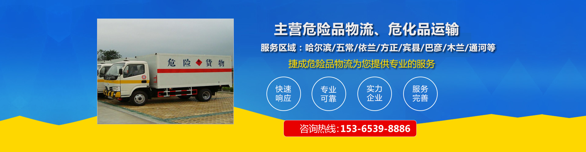 您好,歡迎來到哈爾濱捷成物流有限公司官網!我們為您提供哈爾濱危險品物流公司,哈爾濱;肺锪,哈爾濱危險品運輸等。